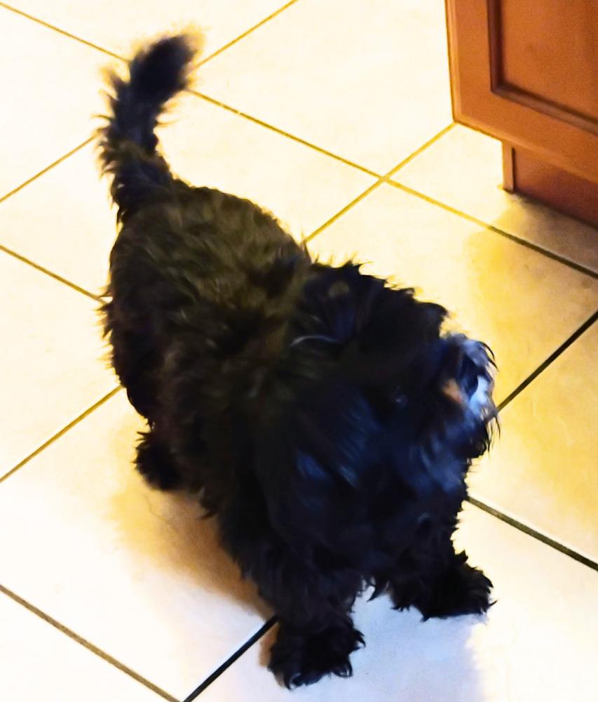 Pet Description:Overgrown black bushy hair with white beard, brown eyes. About 8 lbs. lap dog with cricked tiny teeth. Bat ears with long hair. |