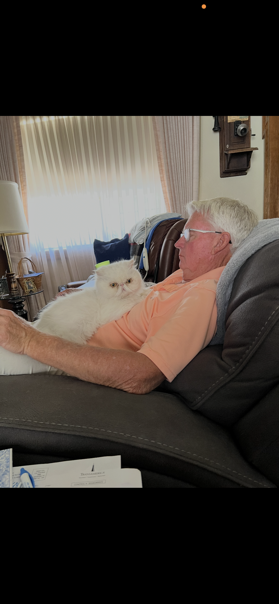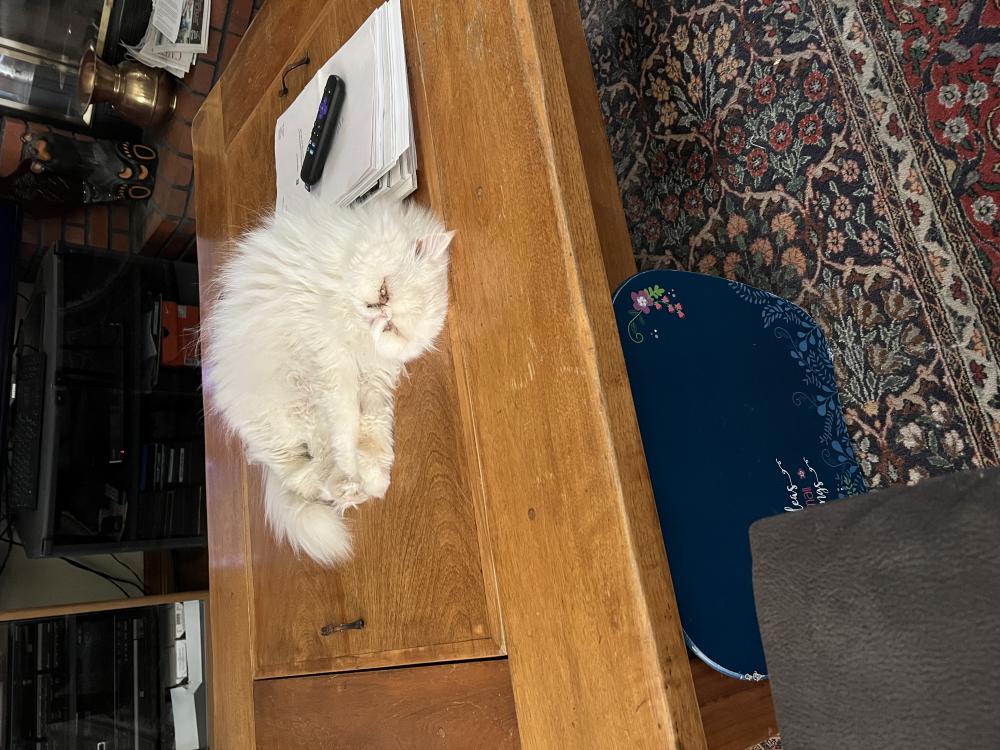 Pet Description:White Persian cat, bery long fur, amber ryes, 12 pounds, flat nose and face. |