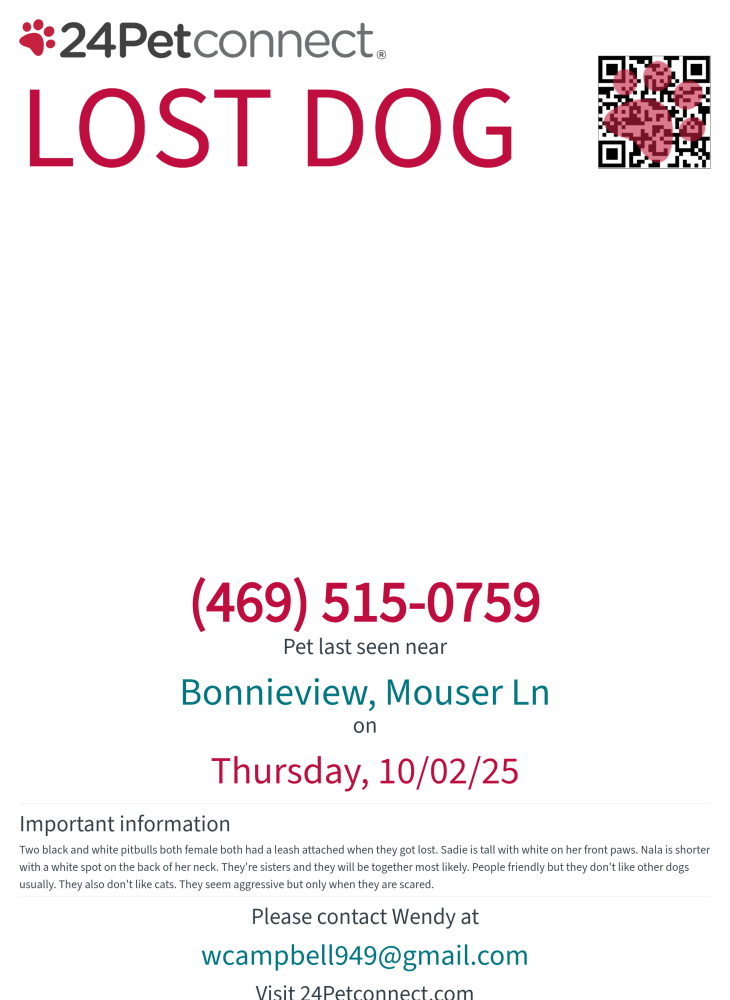 Pet Description:Sadie is black and white and she was with her sister Nala. Both back and white. Both had leashes attached. They're not aggressive unless they are afraid. Sadie is very friendly. They're both friendly but Nala is more cautious. |