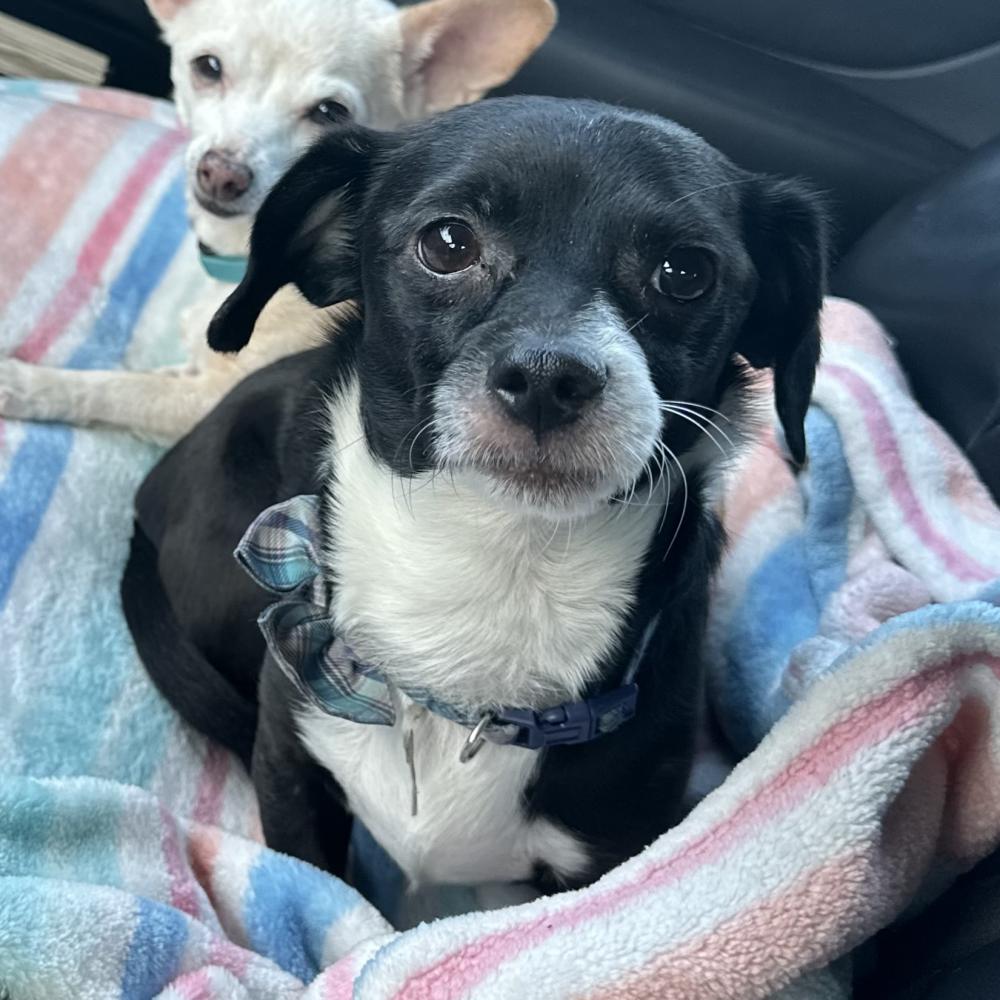 Pet Description:Small black and white chihuahua (mainly black, with white paws, snout, belly and chest). Was wearing a black and white bow-tie collar and white tick collar. |