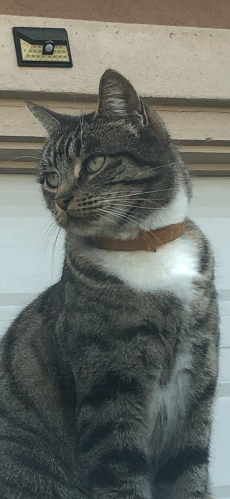 Pet Description:10 year old grey and white striped female. Indoor outdoor cat. Loves to hunt. Smart and aware of strangers . Chipped |