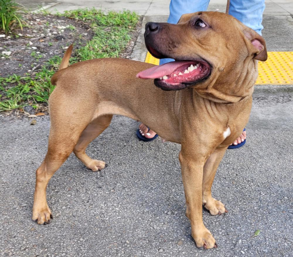 Pet Description:Pitbull mix, light brown with white diamond on chest. Female. |