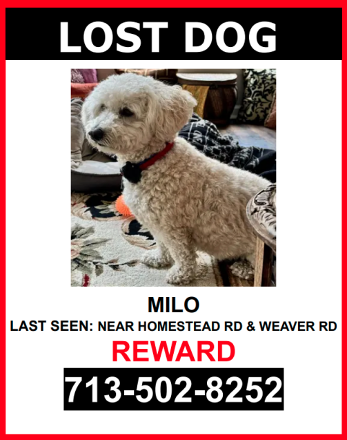 Pet Description:**MISSING SINCE 10/16/2025 AT 11:00 AM** MILO is a WHITE / CHIHUAHUA & MINIATURE POODLE / MALE who escaped and was last seen near HOMESTEAD RD & WEAVER RD. MILO is wearing HIS COLLAR with tags and IS microchipped. If you see MILO, please DO NOT CHASE HIM. PLEASE CALL OR TEXT ONLY. 713-502-8252$$ Reward $$ |