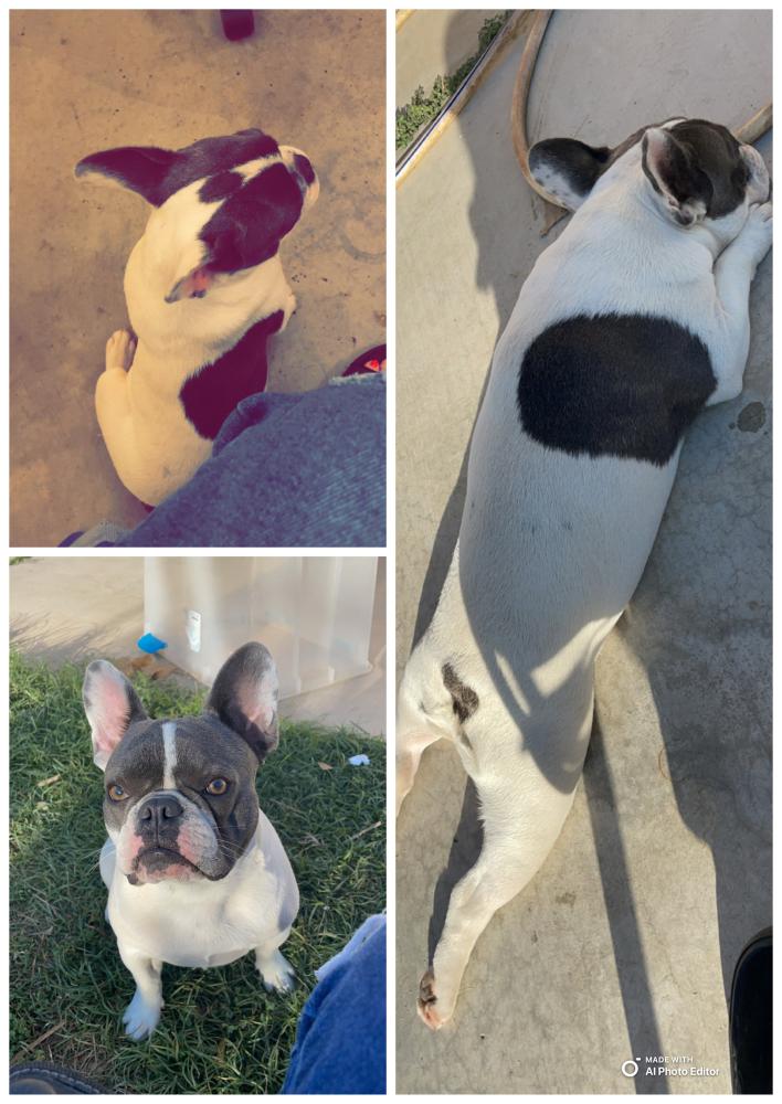 Pet Description:Pied frenchie with white and grey colors. He has an oval spot on top of his head, a big spot on his right side, and a spot on his tail. |