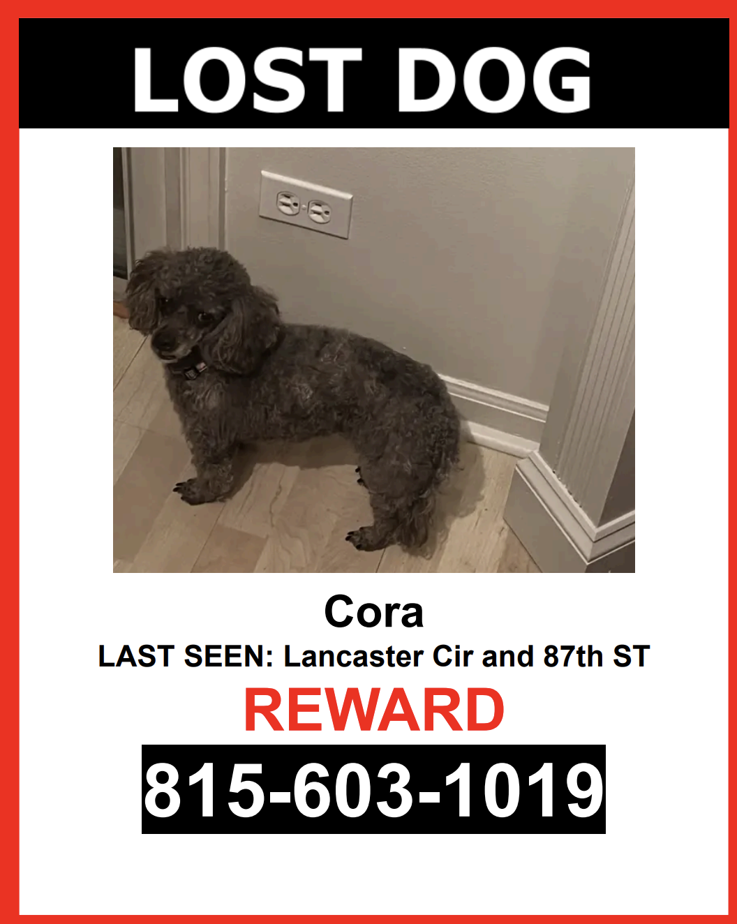 Pet Description:**MISSING SINCE 10/17/2025 AT 7:30 PM** CORA is a FEMALE, GREY, TOY POODLE who escaped and was last seen near Lancaster Cir and 87th ST. If you see CORA please DO NOT CHASE HER. PLEASE CALL OR TEXT ONLY. 815-603-1019$$ Reward $$ |