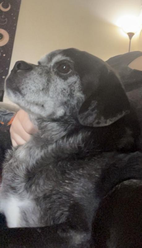 Pet Description:Pug, wiener dog mix. He’s originally brindle color but with is older age he looks black and gray. The gray is around his muzzle, eyes and chest. Chunky dog |