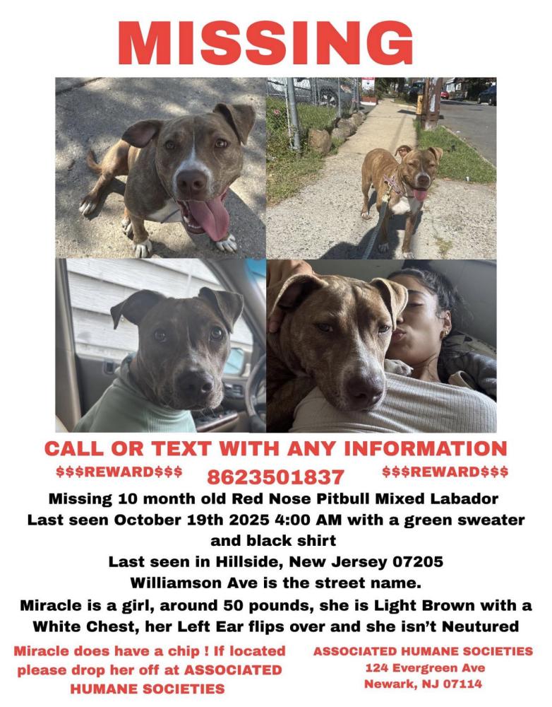 Pet Description:Missing 10 month old Red Nose Pitbull Mixed LabadorLast seen October 19th 2025 4:00 AM with a green sweater and black shirtLast seen in Hillside, New Jersey 07205Williamson Ave is the street name.Miracle is a girl, around 50 pounds, she is Light Brown with a White Chest, her Left Ear flips over and she isn't Neutured |