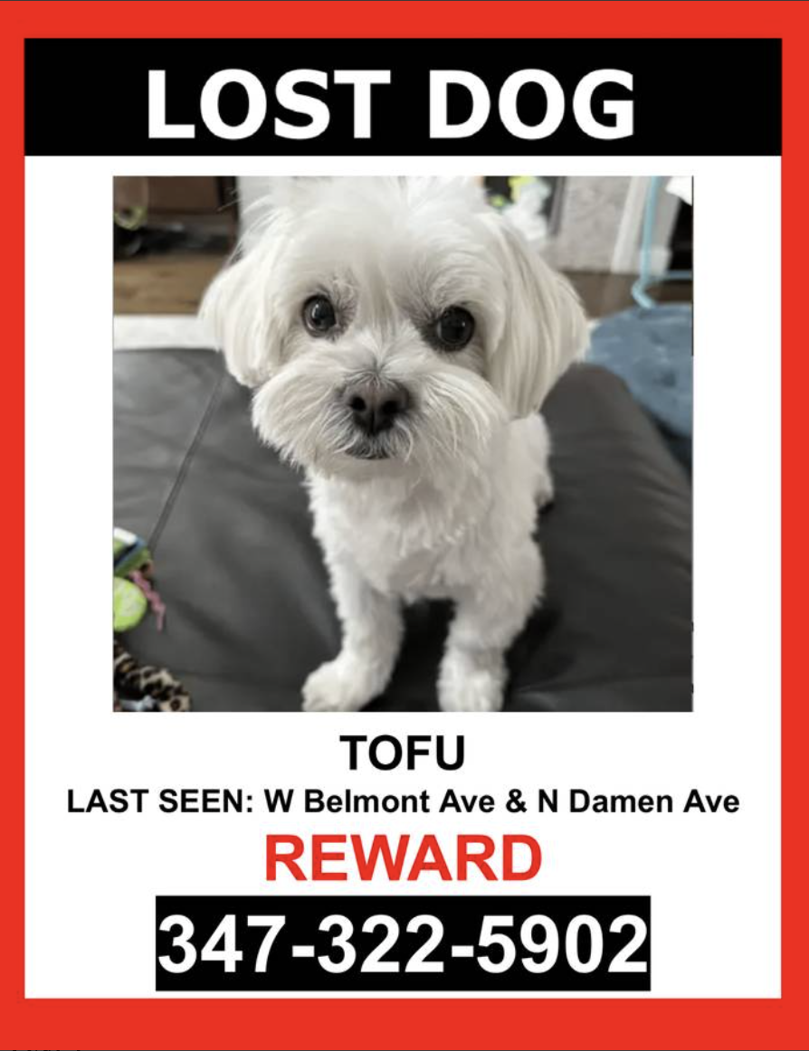 Pet Description:LOST PET - TOFU is a MALE, WHITE, MALTESE who escaped and was last seen near W BELMONT AVE & N DAMEN AVE.TOFU is NOT wearing HIS COLLAR and IS microchipped.If you see TOFU please DO NOT CHASE HIM.PLEASE CALL OR TEXT ONLY. $$ Reward $$ |