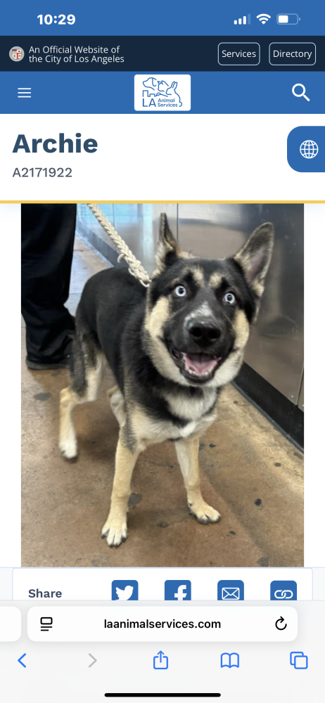 Pet Description:Large black and tan shepherd husky mix with ice blue eyes, the left has a brown spot on the bottom. He’s got a microchip but we couldn’t get in touch with the owners or find someone else to take him in temporarily so he’s at East Valley shelter. #A2171922 |