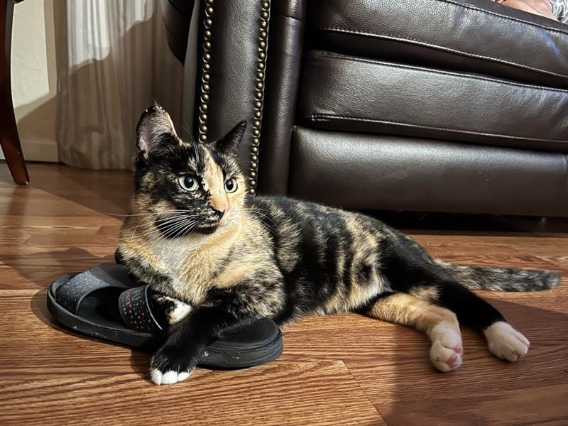 Pet Description:Shorthair tortoiseshell cat, with green eyes, and white paws. 2.5 years old female and spayed. Not chipped. 1/2 black, 1/2 orange lip. |