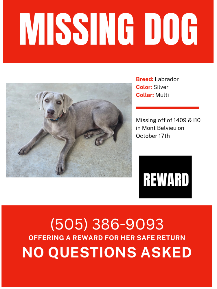Pet Description:Silver lab, 11 months old, wearing a multicolored Hooey collar. She has yellow eyes. |