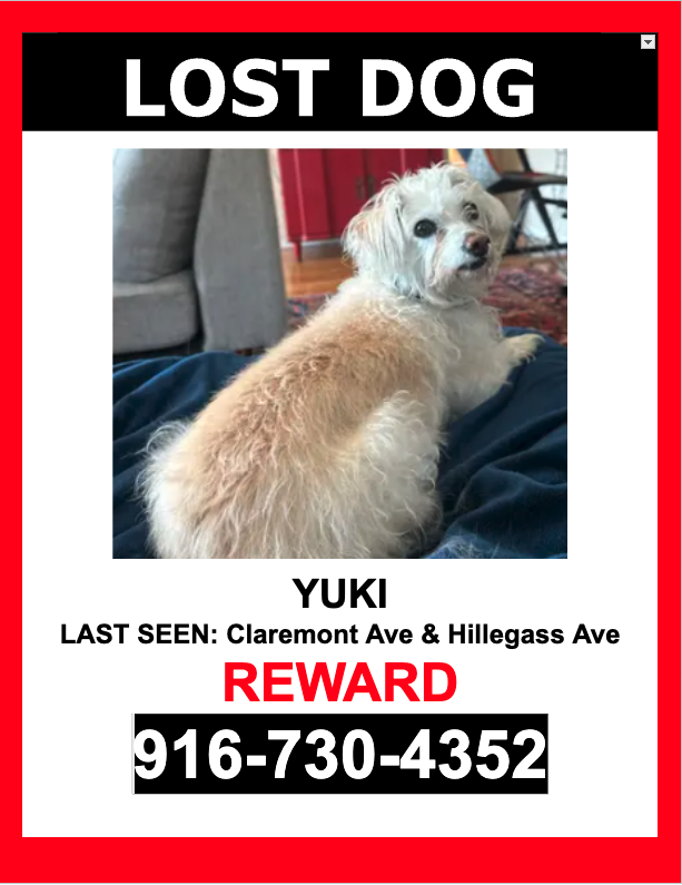 Pet Description:**MISSING SINCE 10/25/2025 AT 12:15 PM** YUKI is a FEMALE, WHITE POODLE MIX who escaped and was last seen near Claremont Ave & Hillegass Ave. YUKI IS microchipped. If you see YUKI please DO NOT CHASE HER. PLEASE CALL OR TEXT ONLY. 916-730-4352$$ Reward $$ |