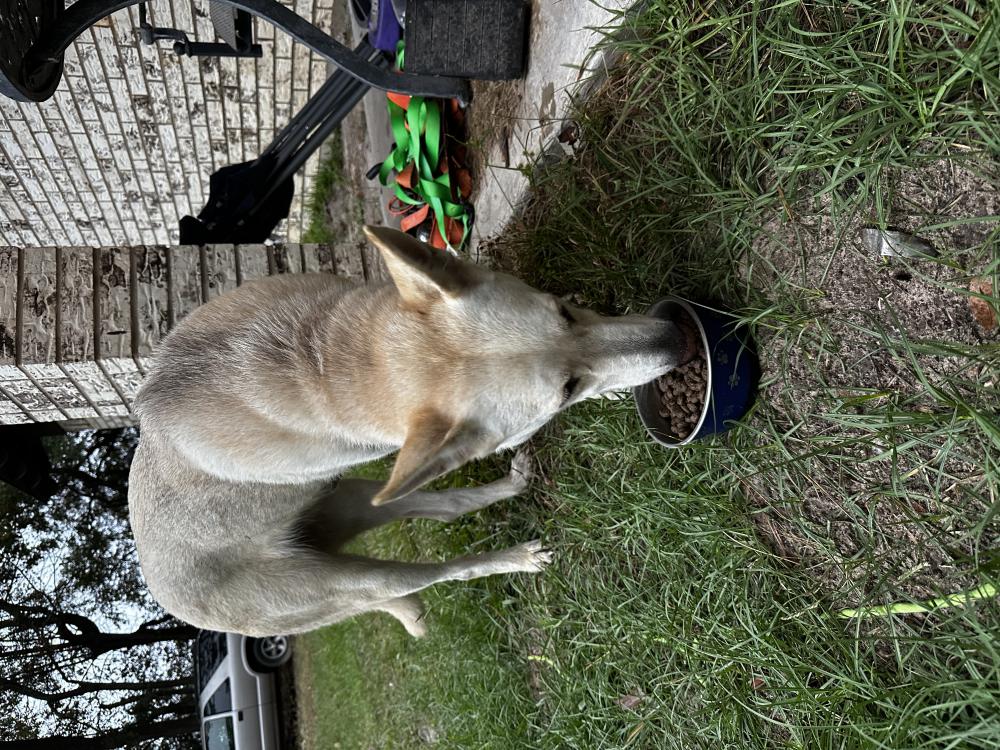 Pet Description:All white/tanish female shepherd breed. Pretty large. No collar. Very sweet |