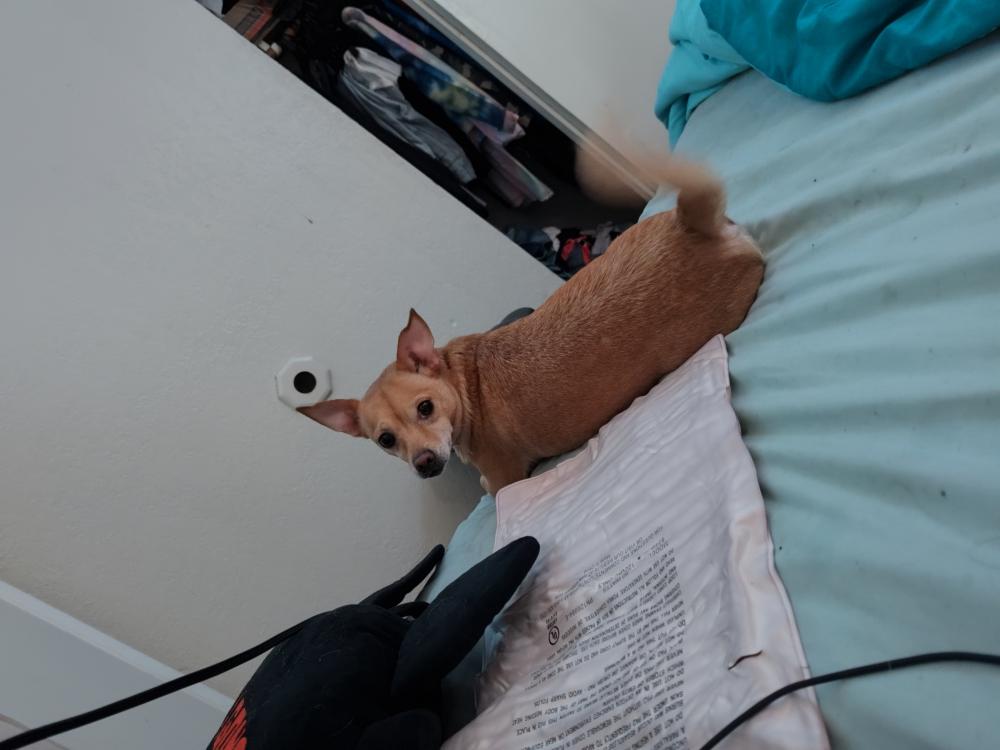 Pet Description:Golden colored Chihuahua, Slightly aggressive towards strangers unless given food. Her tail curls up kind of like a pugs tail. She has a cherry eye on her left eye. |