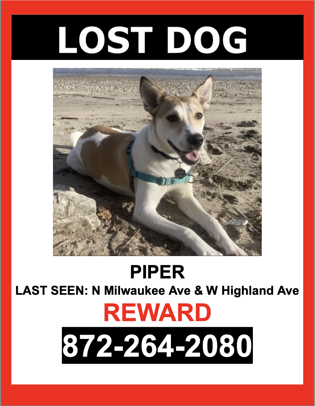 Pet Description:**MISSING SINCE 10/28/2025 AT 6:30 PM**PIPER is a FEMALE, WHITE WITH BROWN SPOTS MIXED BREED who escaped and was last seen near N MILWAUKEE AVE AND W HIGHLAND AVEPIPER is wearing HER LIGHT BLUE COLLAR with tags and IS microchipped.If you see PIPER please DO NOT CHASE HER.PLEASE CALL OR TEXT ONLY.872-264-2080$$ Reward $$ |