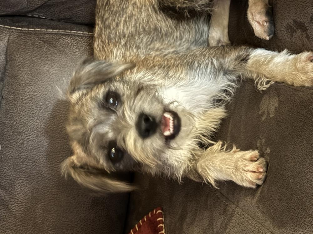 Pet Description:10-12 pound terrier mix, brindle wire hair. Strong under-bite. Under 1 year old. |