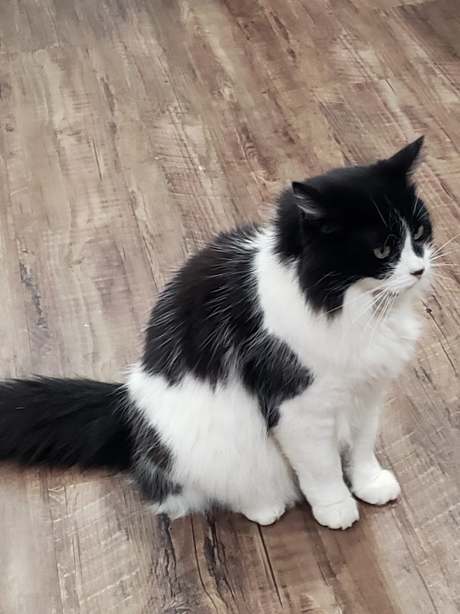 Pet Description:Black and white long hair cat with green eyes. Responds to nail clicking sounds when being called |