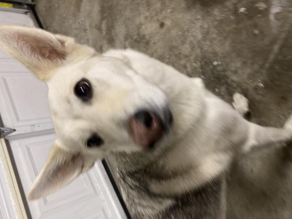 Pet Description:Very friendly, pink nose, mottled tongue, white fur grey back |