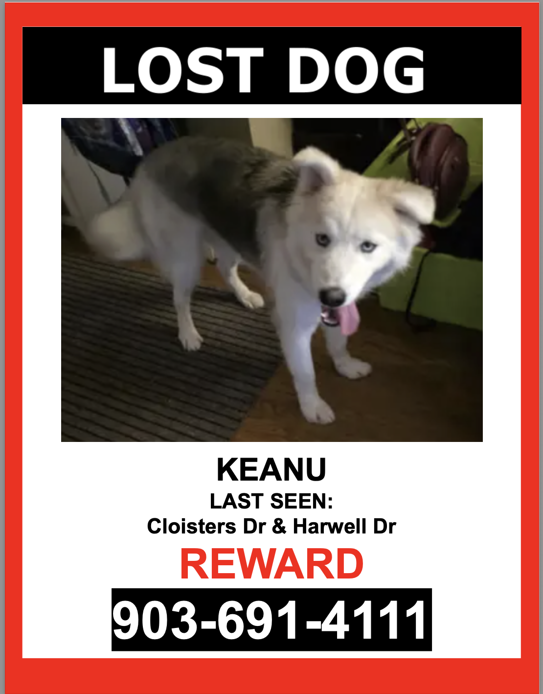 Pet Description:**MISSING SINCE 11/02/2025 AT 10:00 AM** KEANU is a MALE, WHITE WITH BLACK ON TOP, AUSTRALIAN SHEPHERD/SIBERIAN HUSKY who escaped and was last seen near CLOISTERS DR AND HARWELL DR. KEANU is wearing HIS COLLAR without tags and IS microchipped. If you see KEANU please DO NOT CHASE HIM. PLEASE CALL OR TEXT ONLY. 903-691-4111$$ Reward $$ |