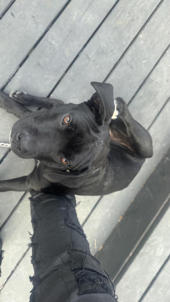 Pet Description:He has a white spot on his rear right paw and a white diamond on his chest with small white specks on his neck and head |