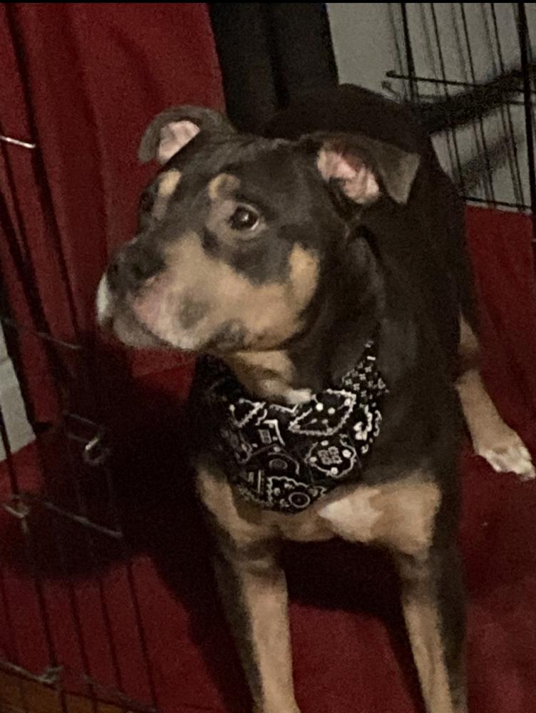 Pet Description:He’s a primarily black, brown and white xl bully, he has a puppy face a black collar with a black and white bandana. |