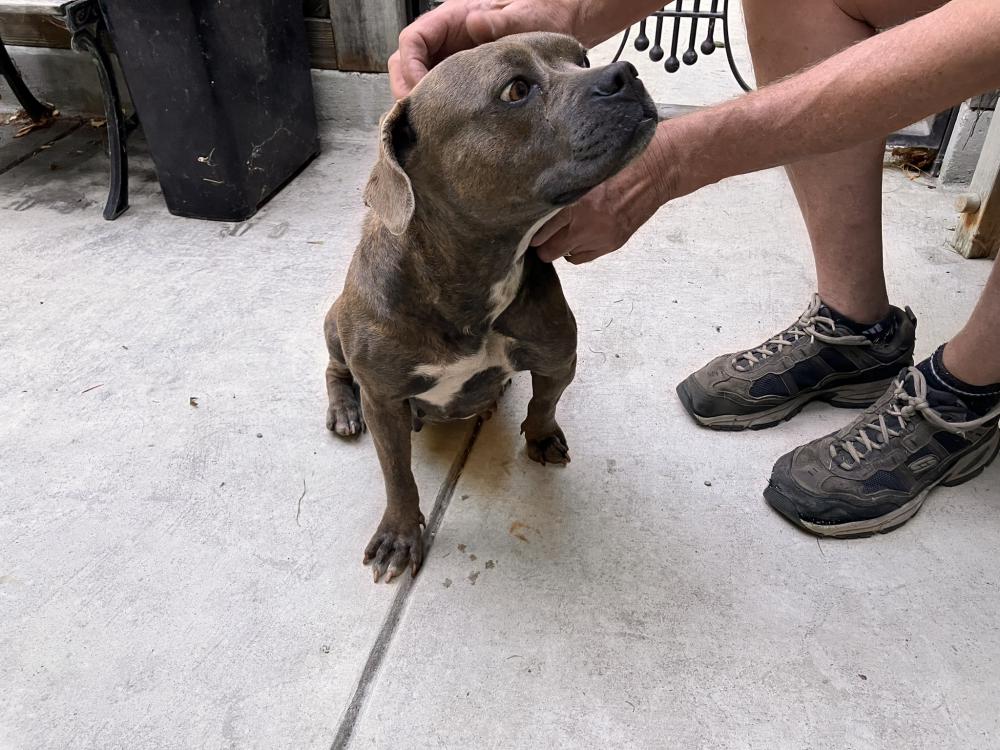 Pet Description:Very calm adult female brindle pit. Docile personality. Doesn't bark. Sits in the sun quietly. Sweet dog. |