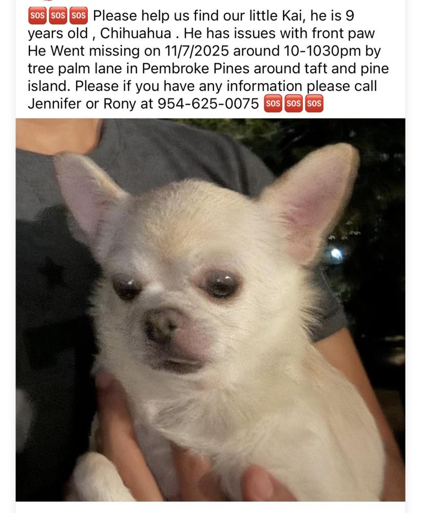 Pet Description:Small chihuahua male 9 year old , no collar , he have issues with his left paw sometimes he limps |