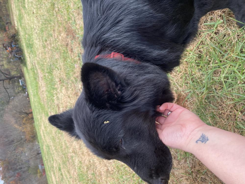 Pet Description:very sweet black German shepherd. Has on a red collar hooked to a red rope. Very very skinny. Seems to have been wandering a while. |