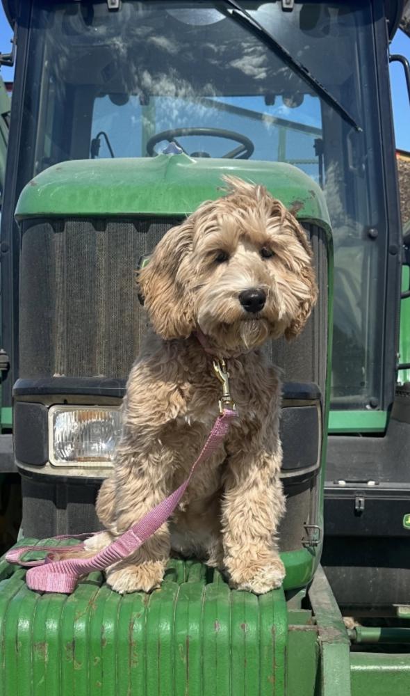 Pet Description:Blonde golden labradoodle with pink collar. Very scared of men. |