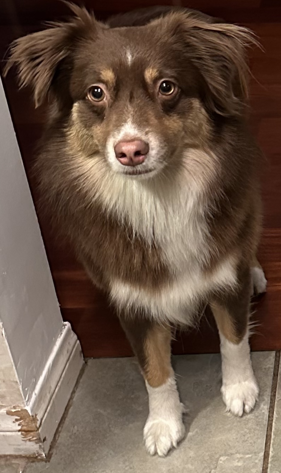 Pet Description:Medium sized Aussie. Mostly brown but has white paws and chest. Brown eyes |