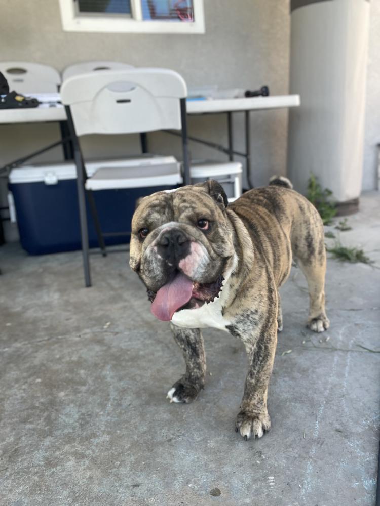 Pet Description:He is a 2 1/2 year old English Bulldog named Mikey. He weights 60lbs and his fur color is Brindle/Tan. He has no collar on, but he is microchipped. |
