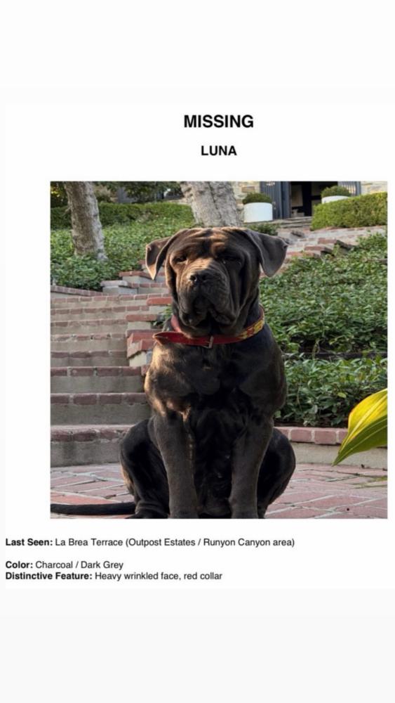Pet Description:A one year old sweet grey cane corso with a collar. She loves people. |