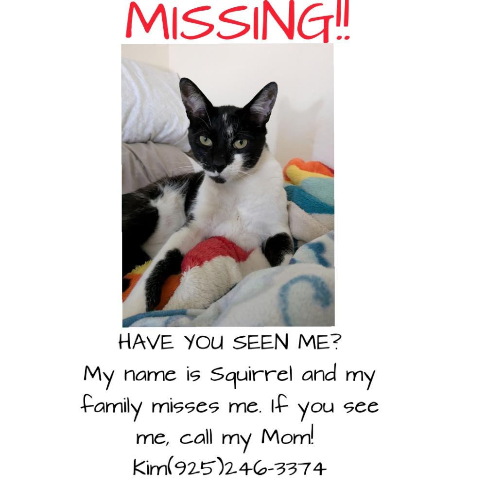 Pet Description:Squirrels face is mostly black but he has a white like a mustache and a small white streak on his head. He is neutered and chipped. He sounds like a baby crying and/or a clicking sound when he meows. |