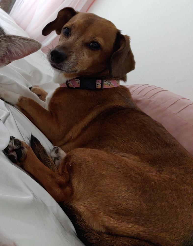 Pet Description:15 year old brown dachshund with white paw. The picture is a little old, she’s got more gray on her face and is skinnier. She’s has poor sight and hearing |