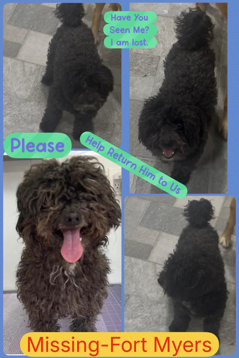 Pet Description:Small, with Black (light black, grayish) Curly/Shaggy hair, White hair on Chin/Chest. |