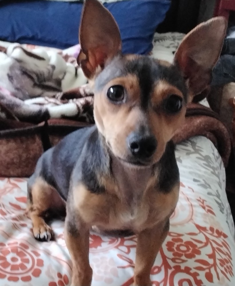 Pet Description:Black and inner brown tummy black nails miniature Pinscher purple collar with bell |