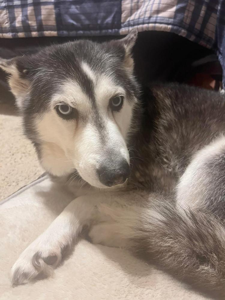 Pet Description:Older, black and white husky with baby blue eyes. He is scared of storms and loud firecrackers, locks himself clean (I think he is OCD) he does have allergies and needs medication |