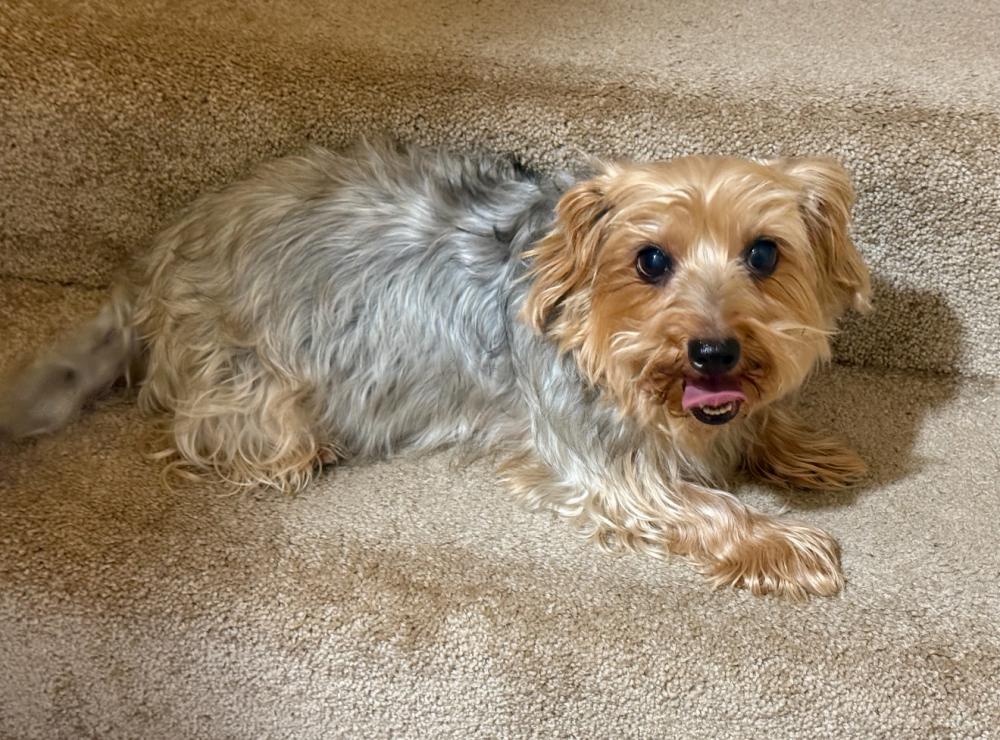 Pet Description:Name: ChloeBreed: Yorkiepoo (Yorkshire Terrier / Poodle mix)Sex: FemaleWeight: 10–12 lbsColor: Tan and silverCoat: Medium length, soft, slightly wavySize: Small, compact bodyDistinguishing Features / Medical Identifiers: • Several surgical scars on her tummy from previous cancer surgeries • Scar area may look slightly uneven or may have thinner hair • Very sensitive abdomen • Unique coloring: tan body with silver highlights, especially on her back and headTemperament: • Gentle and sweet, but ver |