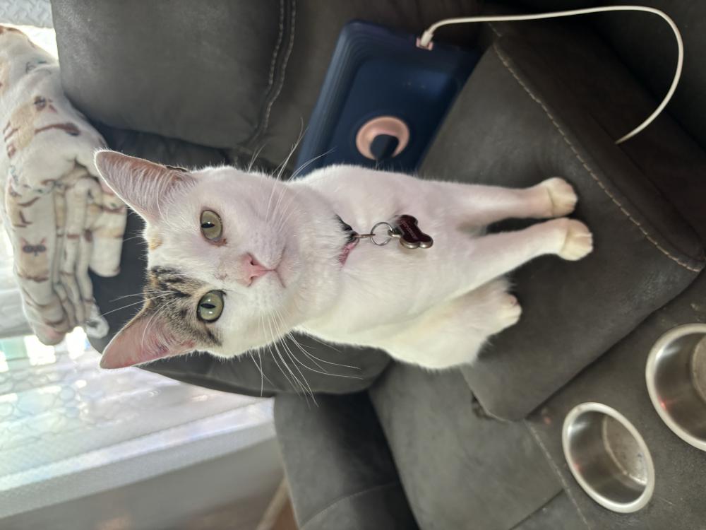 Pet Description:Majorly white cat with brown spots a big one surrounding her eye, a heart shaped brown spot on her back and a colored brown tail. She may still have her pink collar, with has a bell with a design of crowns on it. |