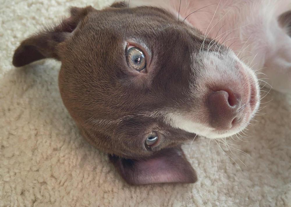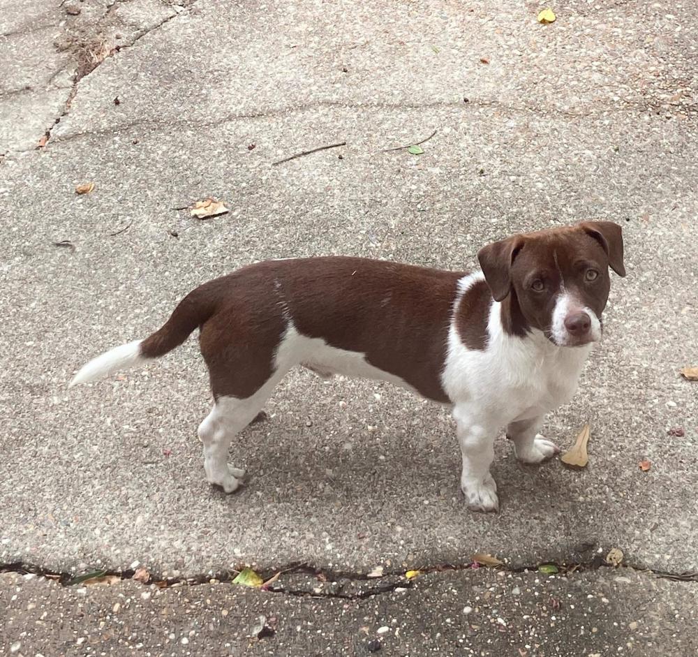 Pet Description:White body with brown patches, yellow eyes with gray. Small dog looks like mix between pit bull and basset hound.Microchipped Rolls over if you pet him. |