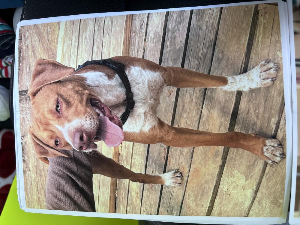 Pet Description:Rust brown with white. Friendly but probably frightened. Please do not chase. Please call or text 336-816-0965 with location, time of sighting, and direction of he was heading. |