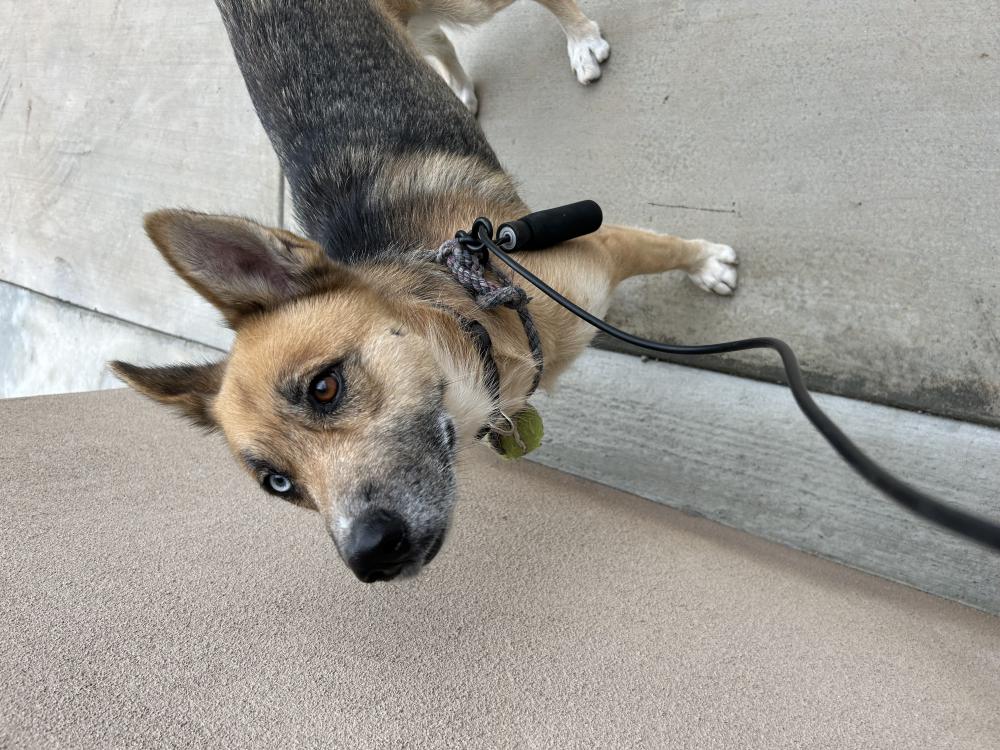 Pet Description:German Shepard mix with two different colored eyes and tennis ball on collar. |