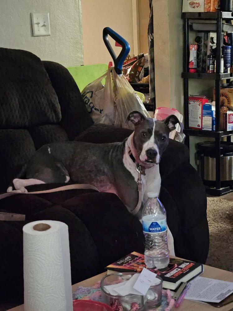 Pet Description:She is grey and white with a purple harness and a purple collar. |