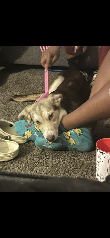 Pet Description:He has brown and white fur ,bug ears ,and a brown and green eyes but the blue eye is fading to brown |