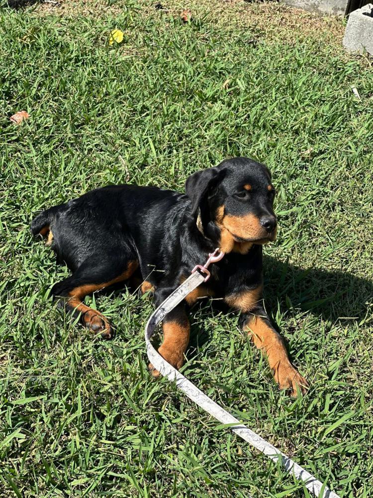 Pet Description:German Rottweiler. Wavy silky coat, not aggressive. Very timid. Does not walk on a lease. Had a blue collar on. He is 3 months old, and weights about 30lbs. Had a patch of missing hair on both sides. Had a scar under his neck. Tail is doc. |