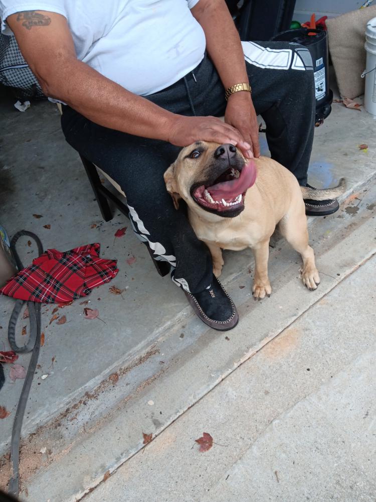 Pet Description:Light tan medium pit bull well-groomed with no collar. |