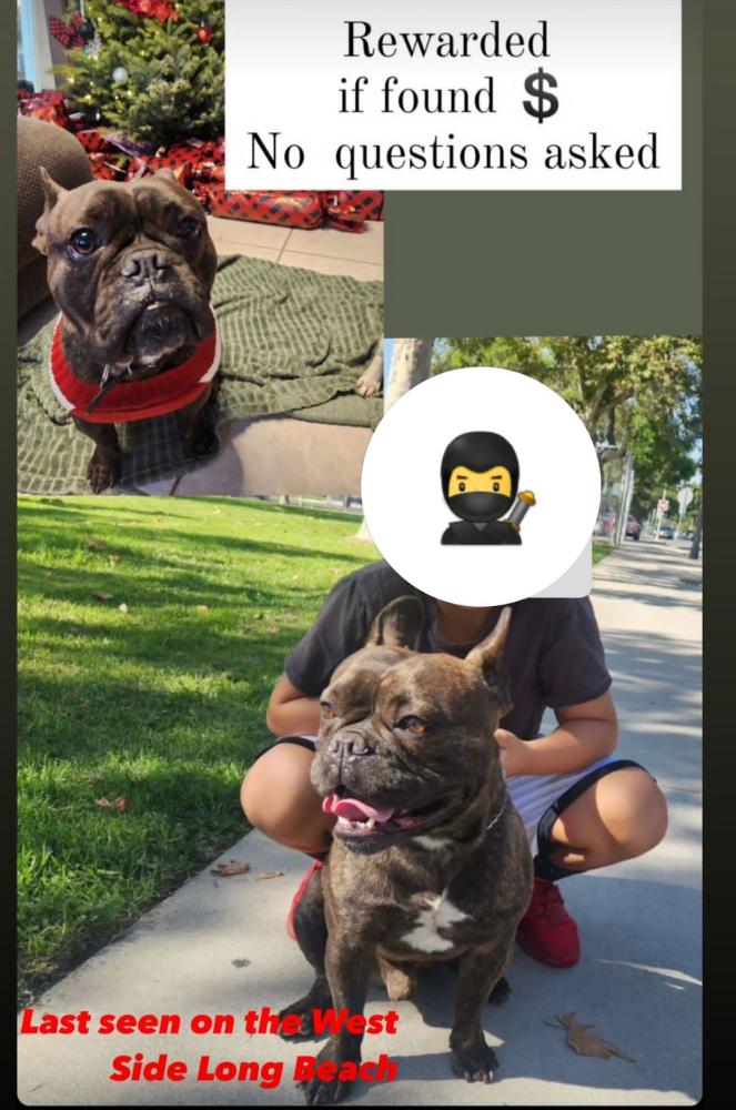 Pet Description:Black and brown (brindle) French bulldog white chest wearing a black collar. He's on the bigger end of french bulldogs. REWARD $$ |