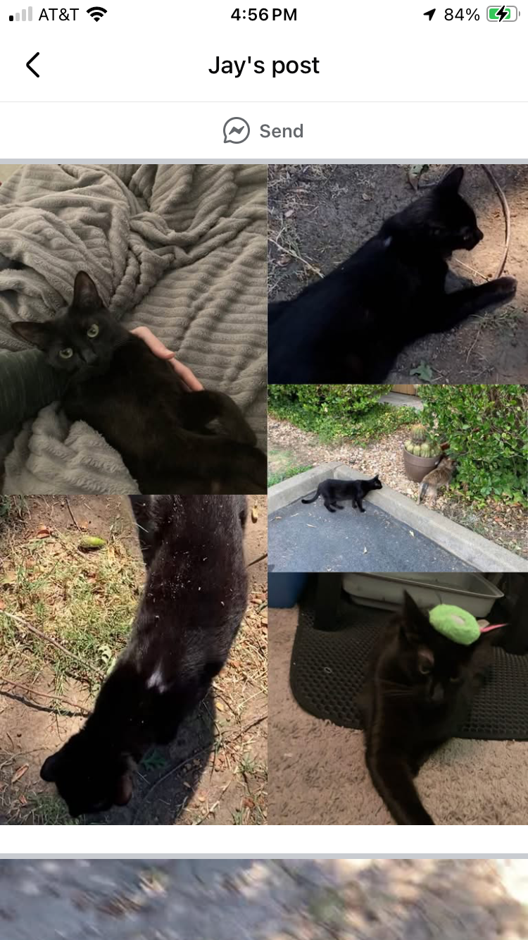 Pet Description:All black with Greenish yellow eyes and may have a patch on shoulders . Very shy and skittish she is microchipped $150 reward |