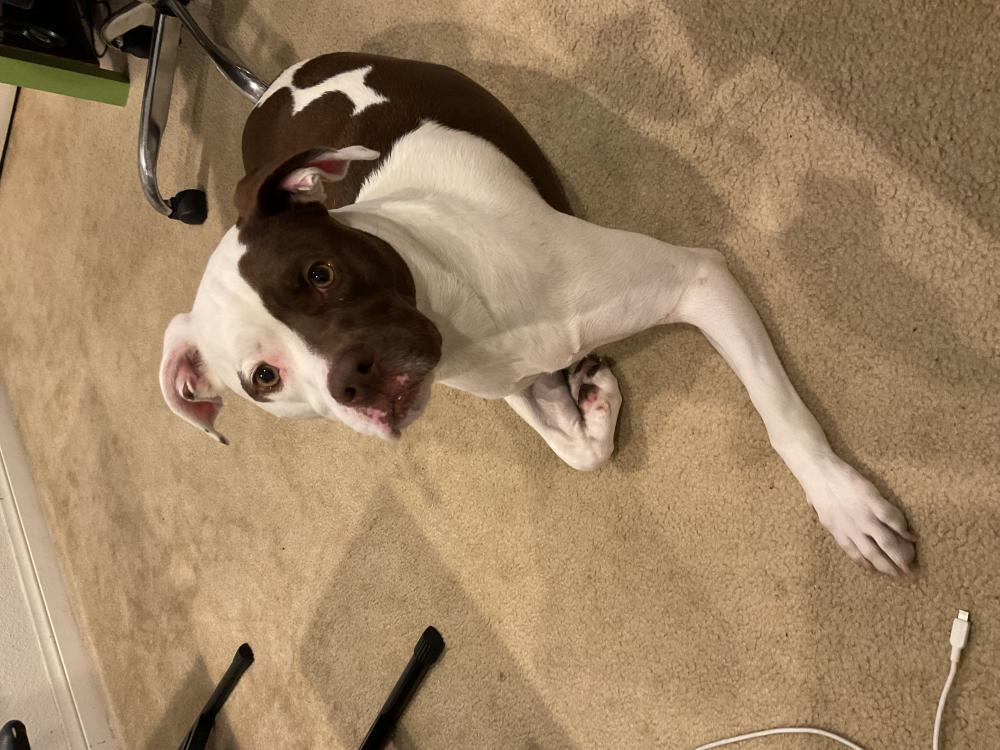 Pet Description:Medium size white with dark brown spots on face and body |