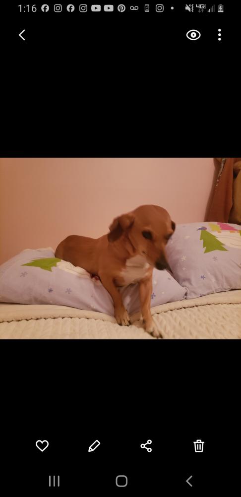 Pet Description:22 lbs. White patch on chest and white front toes (can't remember what color his back toes are). Big dark brown puddle eyes. Has stranger danger but a very nice dog who loves to cuddle. |